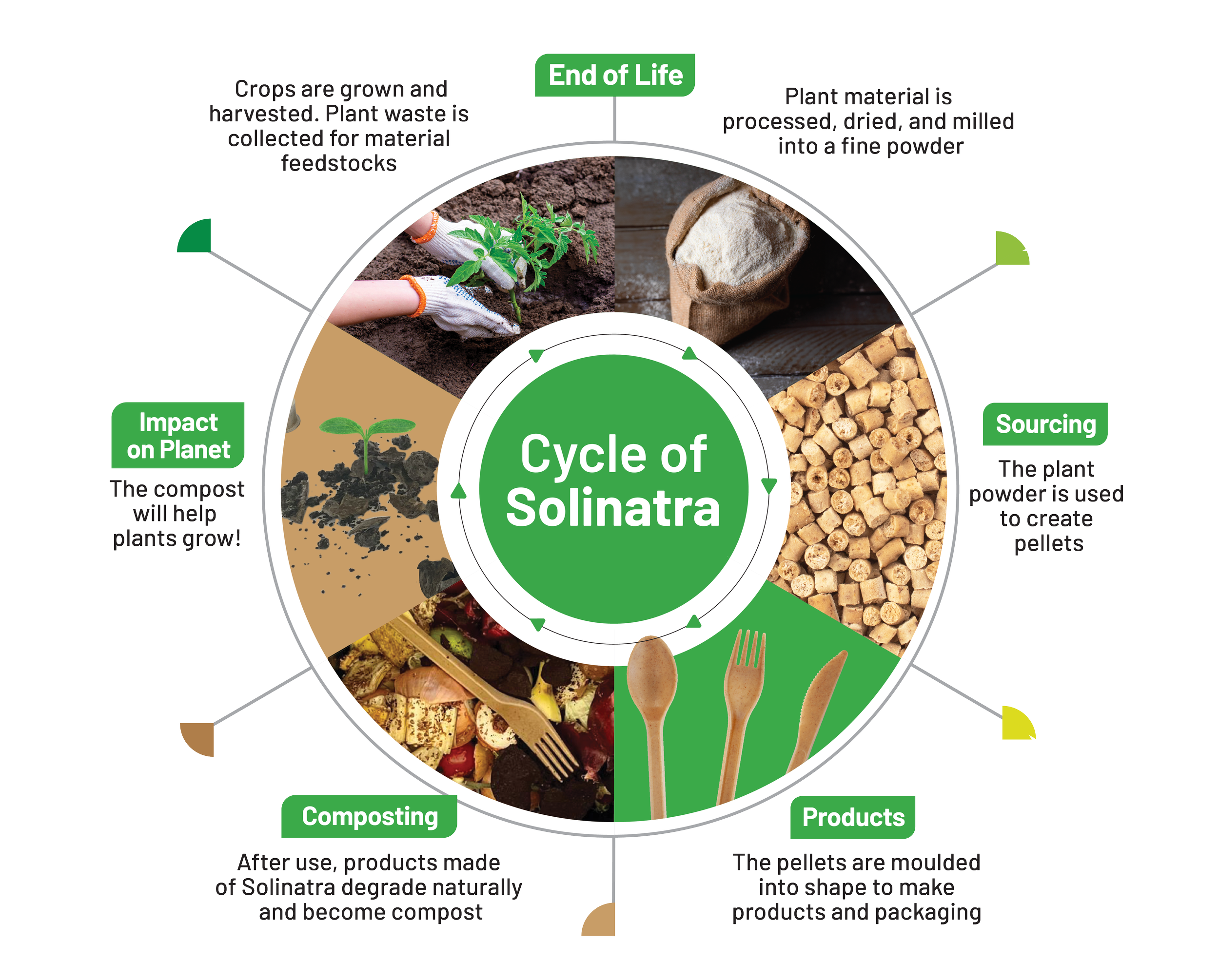 After use, Solinatra is designed to return through biodegradation and composting rather than remain as long-term waste. It becomes biomass that can nourish soil and support new growth, helping crops grow again and continuing the loop. This is Solinatra’s circular economy cycle in its simplest form: grown, repurposed, formed, composted, grown again. A material designed to finish its job and return responsibly, so nothing harmful remains.